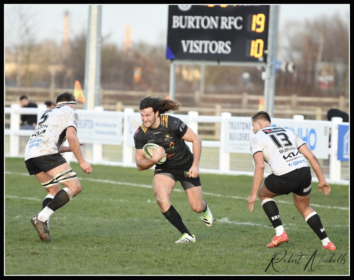 Needham then had to leave the field through his injury and Cole went to scrum-half and Gareth Bladen to fly-half, these changes also included the welcome return of Jordan Burgess onto the wing. Burton continued to press forward and when Bradbury was well offside in defence, the home side kicked for a fifteen-metre lineout. The ball was well stolen by Evitt from the driving maul and he kicked forward out of defence, Burton ran the ball back however and their outside centre and vice-captain gave the inside pass for the ever-present scrum-half to cross for another try.