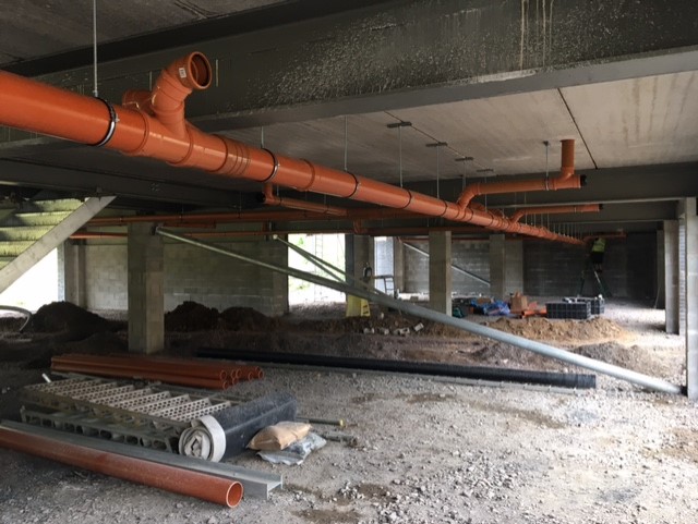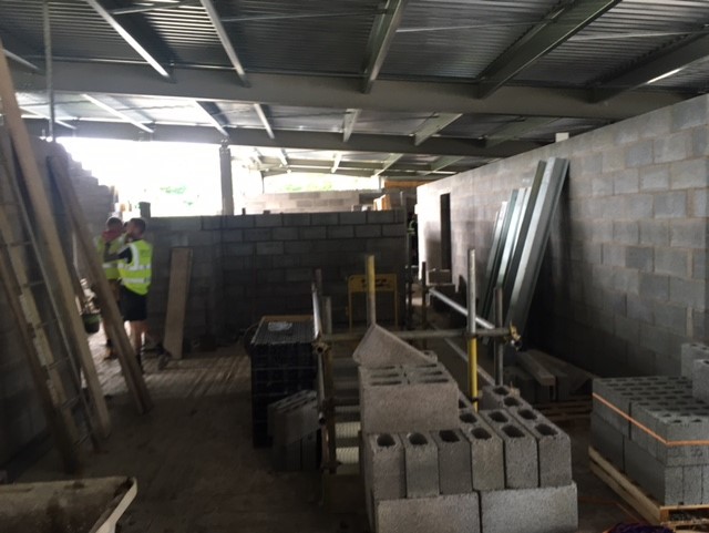 The works done in June and early July are-Continuation of Blockwork external walls and internal partitions.-Scaffolding for final lifts of Blockwork continuing-completion of Roof sheeting and Vapour barrier, work continuing for fascia’s, gutters and soffits with the layers of insulation, PV panels and sedum layers to the roof to follow.- installation of the underslung drainage to the soffit of the floor slab from each gully or drain point in the slab for the changing and kitchen facilities.- road grading and kerbing to the Bandon Lane continuing- trench work and laying of cables and ducts for services substantially complete in the under slab areas- first fix joinery commenced in month with door frames and temporary protection works for screeding to commence in July.