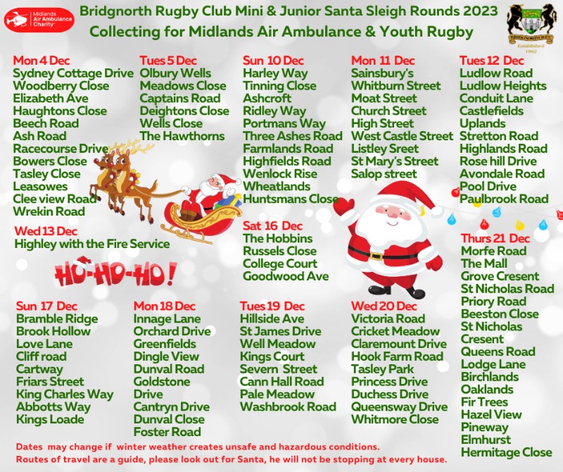 12 Santa runs visiting the sctreet of Bridgnorth collecting fund for M&J Rugby and Midlands Air Ambulance.