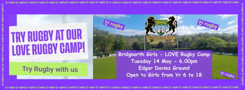 Bridgnorth RFC will run a Love Rugby camp on Tuesday 14 May and then will have four weekly summer rugby sessions on Tuesday May 21st, June 4th, June 11th and June 18th, Girls of all abilities are encouraged to attend, and gain from the benefits the sport brings to physical and mental health.